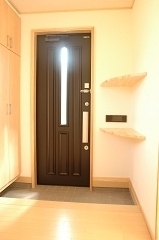 木部とホットブラウンのきれいな玄関。収納もいっぱい。